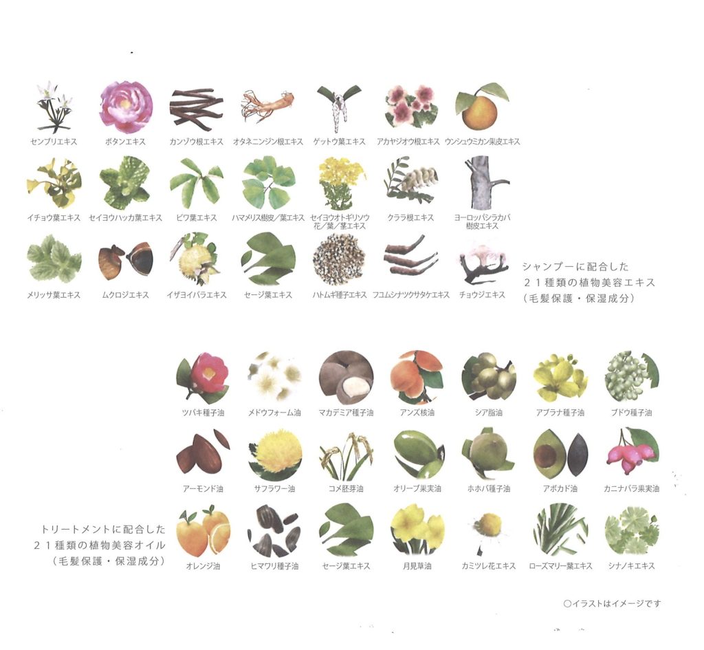 きめ細かい泡で髪をやさしく洗い上げ、ハリ・コシ感のある髪へと導くシャンプーと、根元から毛先まで、つや感のあるサラサラした指どおりの良い仕上がりのトリートメント。21種類の植物美容エキス(毛髪保護・保湿成分)とヘマチン(毛髪保護成分)、保湿成分であるPOD(ピロリジニルジアミノピリミジンオキシド)、プラセンタエキスを配合。ボタニカルハーブの香り。トリートメントは、合成着色料無配合。