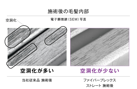 ファイバープレックス ストレートで施術した場合、従来品と比べて毛髪内部の空洞化が少なく、しっかりと毛髪内部が保護されていることが確認できました。