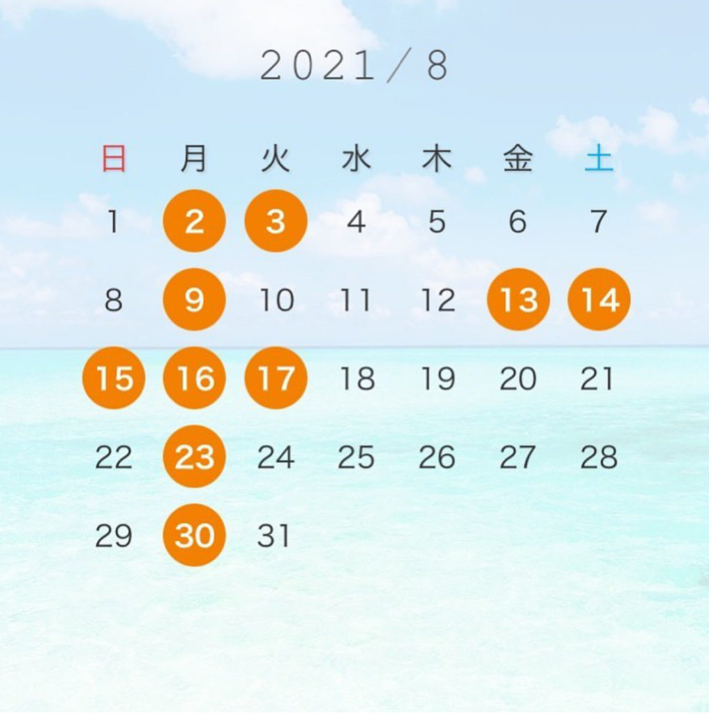 お知らせ 8月お休み、夏休みのお知らせ waco2021年7月11日2021年7月11日 13日から17日まで夏休みさせていただきます.ご迷惑おかけ致しますが何卒よろしくお願い致します。 waco 投稿を作成しました 87